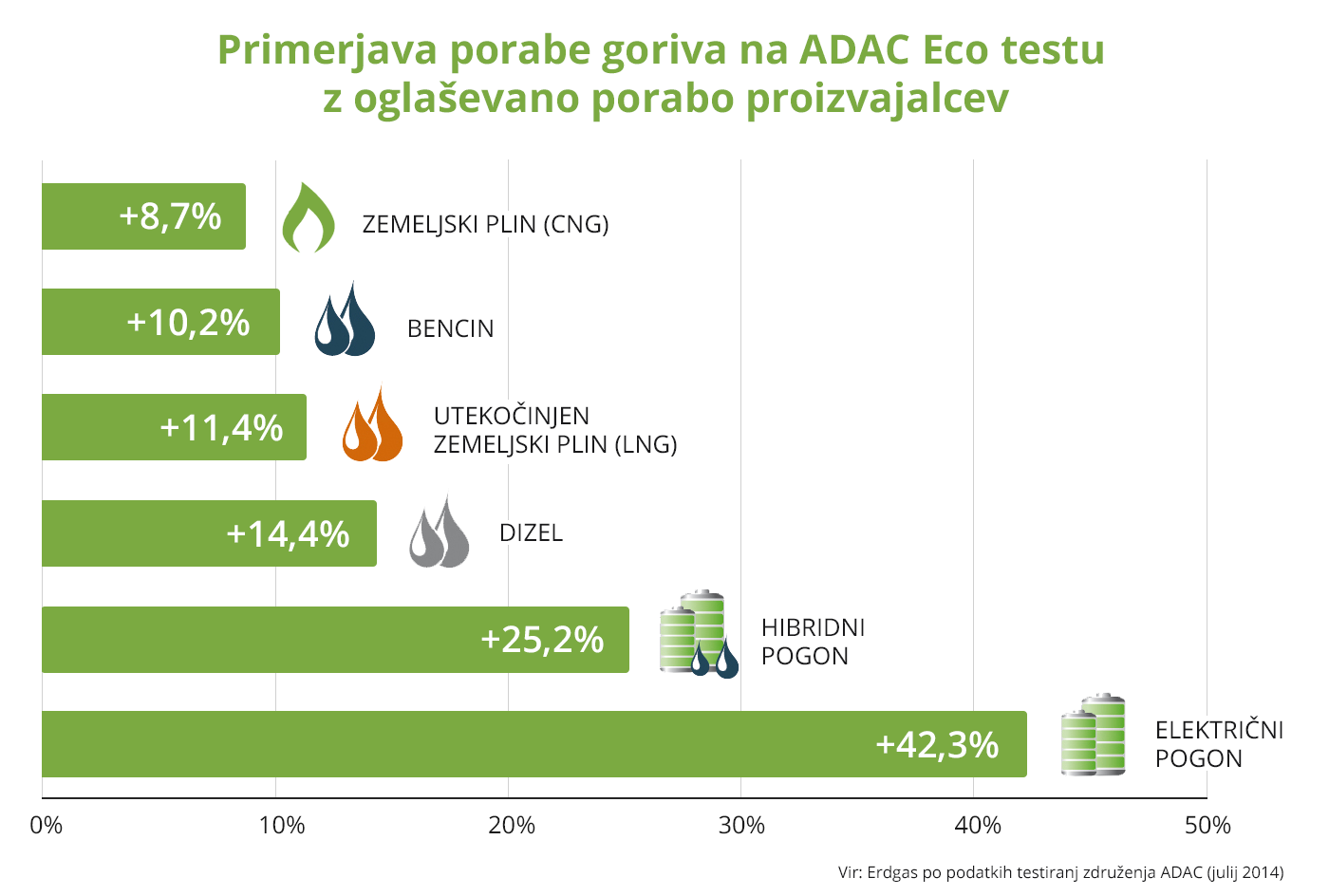 Na primer Toyota Prius 1.8 Plug-In Hybrid je v realnih voznih razmerah ADAC-ovega »EcoTesta« potrebovala kar 73 % več energije od oglaševane. Ko se baterija izprazni, poraba bencina zelo naraste in nizkih vrednosti porabe ni več mogoče doseči. »Izbira testne proge pomembno vpliva na rezultate,« je komentiral Kehler. Kupci avtomobilov zato pogosto ne dosežejo tovrstnih prihrankov, na katere so upali po branju oglaševanih podatkov o povprečni porabi. Povprečni stroški goriva za prevoženih 100 km se za hibridna vozila, kot je npr. Toyota Prius 1.8 Plug-In, gibljejo okoli 7 evrov. Če primerjamo ta strošek s stroškom prevoženih 100 km z avtomobilom na stisnjen zemeljski plin, ki npr. pri Audiju A3-tron g znaša približno 4 evre, ugotovimo, da so avtomobili na stisnjen zemeljski plin na cesti povprečno veliko cenejši od hibridnih vozil. »Rezultati ADAC-ovega testiranja so pokazali, da so vozila na stisnjen zemeljski plin najbolj ekonomična v primerjavi z vozili na druga pogonska sredstva in da so se odrezala celo bolje, kot smo pričakovali,« je zaključil Kehler.