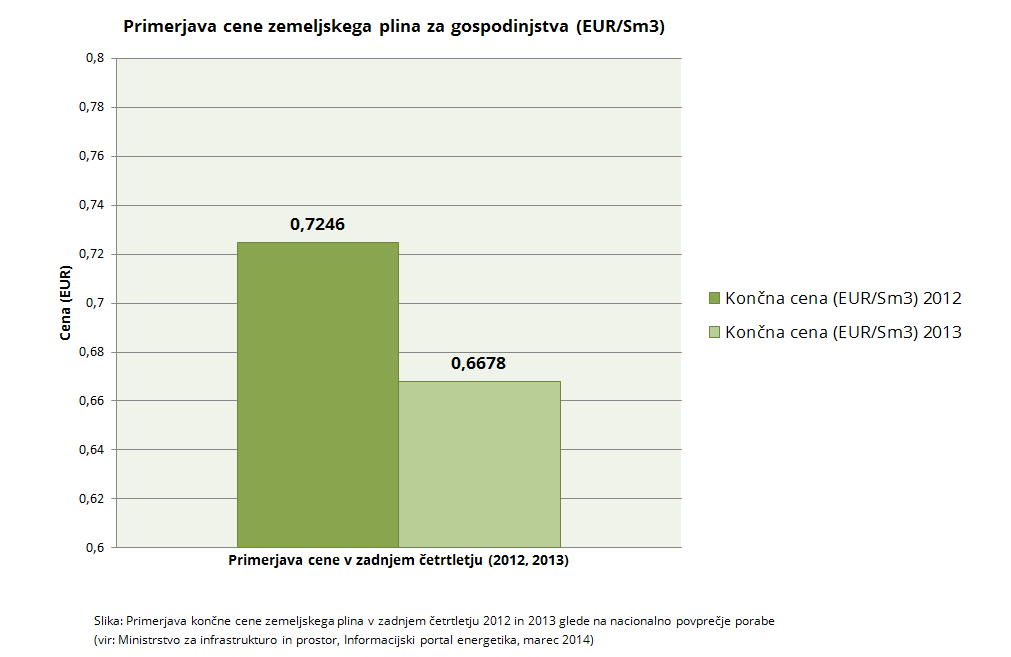 Statistični podatki kažejo, da je končna maloprodajna cena zemeljskega plina za povprečnega gospodinjskega odjemalca v zadnjem četrtletju 2013 znašala 0,6678 EUR/Sm3. To je 8 % manj kot v zadnjem četrtletju leta 2012.