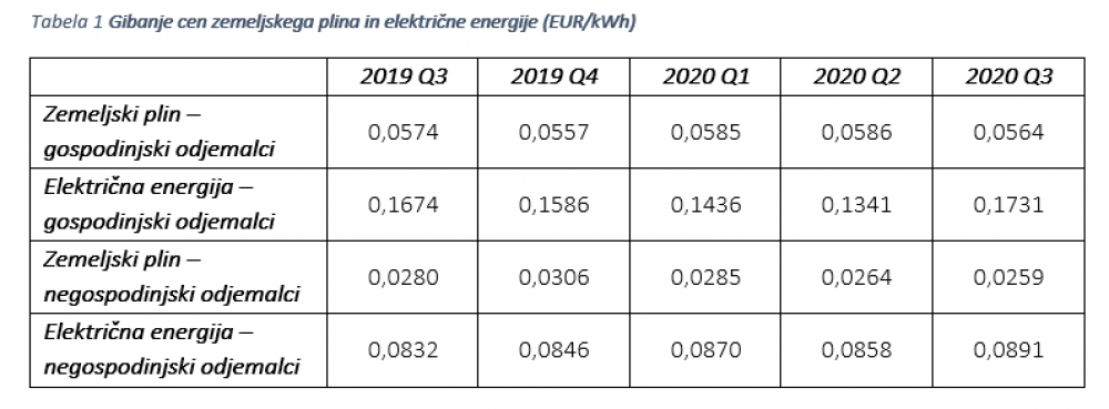 Povprečna cena zemeljskega plina za gospodinjske odjemalce v Sloveniji se je v tretjem četrtletju glede na drugo četrtletje znižale za štiri odstotke in je znašala 0,0564 EUR/kWh. Cena električne energije za gospodinjske odjemalce pa se je v enakem obdobju povišala za 29 odstotkov in je znašala 0,1731 EUR/kWh.