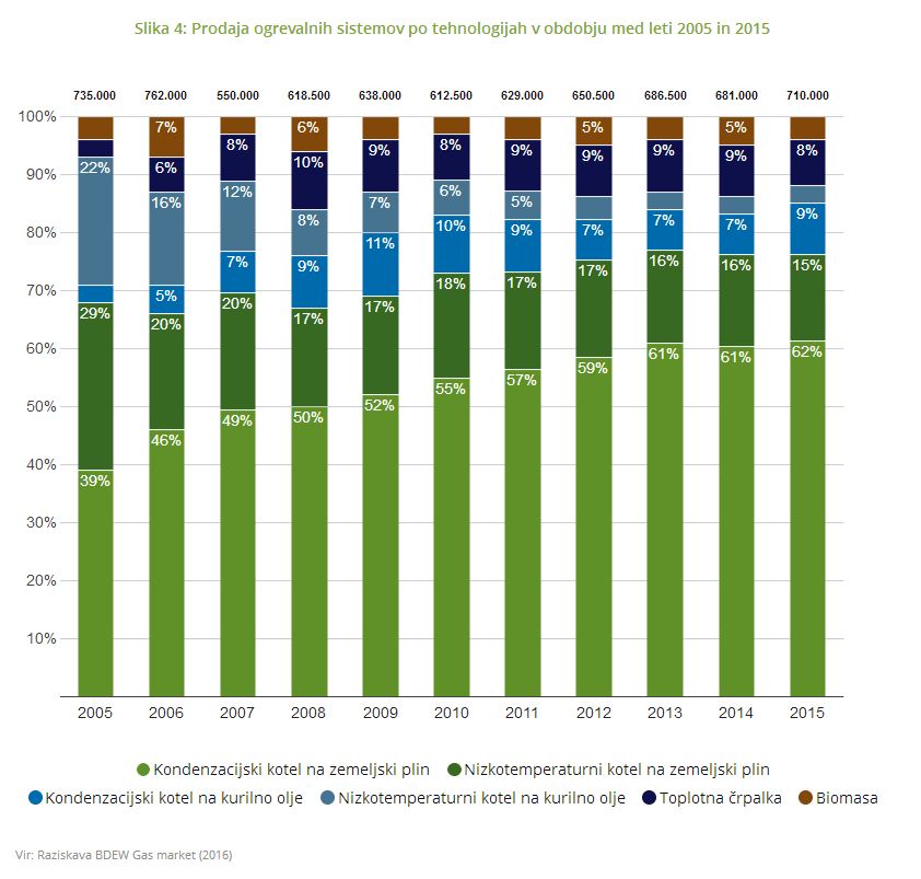 Od leta 2005 Nemčija zaznava strmo naraščanje prodaje nizkotemperaturnih kotlov na zemeljski plin. V letu 2015 je delež kondenzacijskih kotlov na zemeljski plin in nizkotemperaturnih kotlov na zemeljski plin skupno znašal 77 % vseh prodanih ogrevalnih sistemov. Raziskava je pokazala izrazit trend v porastu ogrevalnih sistemov na zemeljski plin v zadnjih letih. Čeprav ogrevalni sistemi na zemeljski plin že dosegajo velik delež, se ta v državi še povečuje. Poleg tega Nemčija še povečuje plinsko infrastrukturo, zato je mogoče pričakovati še večji delež prodanih ogrevalnih sistemov na zemeljski plin.