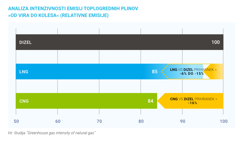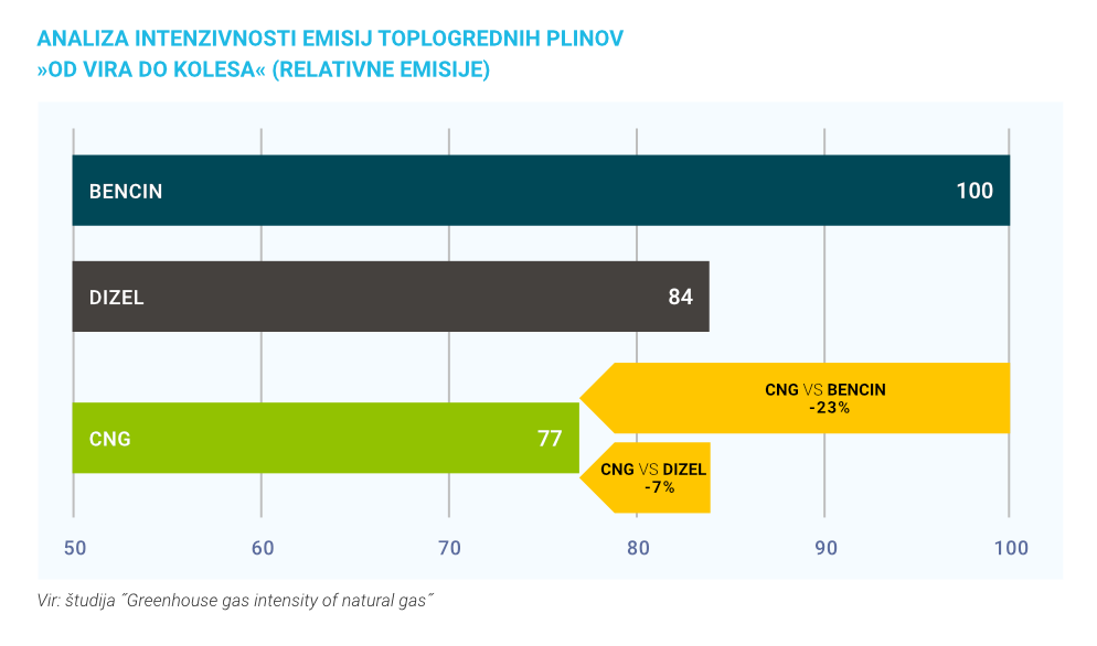 Študija z naslovom Intenzivnost emisij toplogrednih plinov zemeljskega plina, v katero je več kot 50 podjetij prispevalo svoje dosledne in visokokakovostne podatke o zemeljskem plinu, prikazuje, da bo ključno vlogo pri dekarbonizaciji transporta imel zemeljski plin. Analiza na podlagi »od vira do kolesa« kaže, da je intenzivnost emisij toplogrednih plinov CNG za kar 23 % manjša od emisij toplogrednih plinov bencina in za 7 % manjša v primerjavi z dizelskim gorivom.